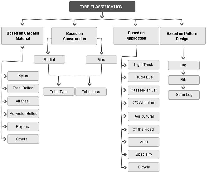 ยางเหล่านี้สามารถแบ่งได้เป็นยางเรเดียล ยางไบแอสเรเดียล ยางไฮบริดเรเดียลไบแอส ยางเหล็กทั้งหมด ยางเสริมเส้นใย และยางนิวแมติก ประเภทที่ใช้กันทั่วไปในรถยนต์นั่งรายวันคือยางเรเดียล